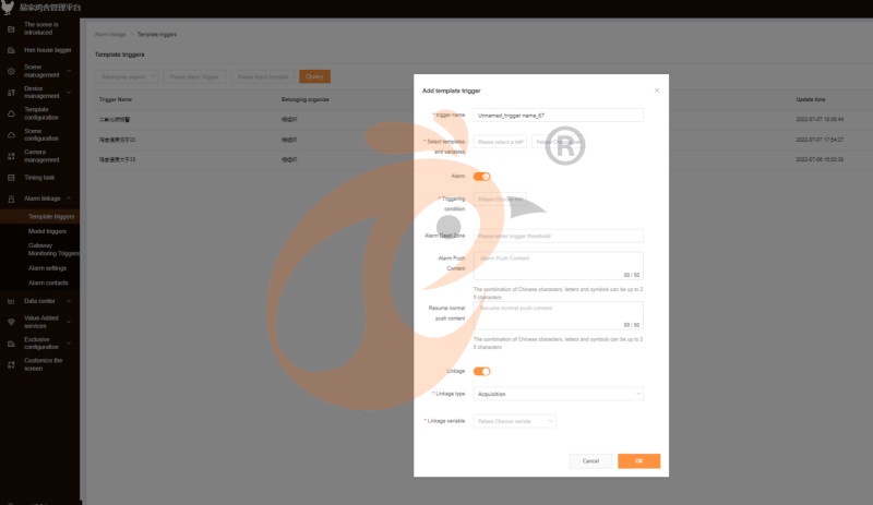 Linkage control: Trigger type, trigger condition, control object, control data delivery can be set, for example, equipment settings (such as air conditioning temperature and wind speed) can be automatically adjusted according to environmental conditions (such as indoor temperature and humidity).